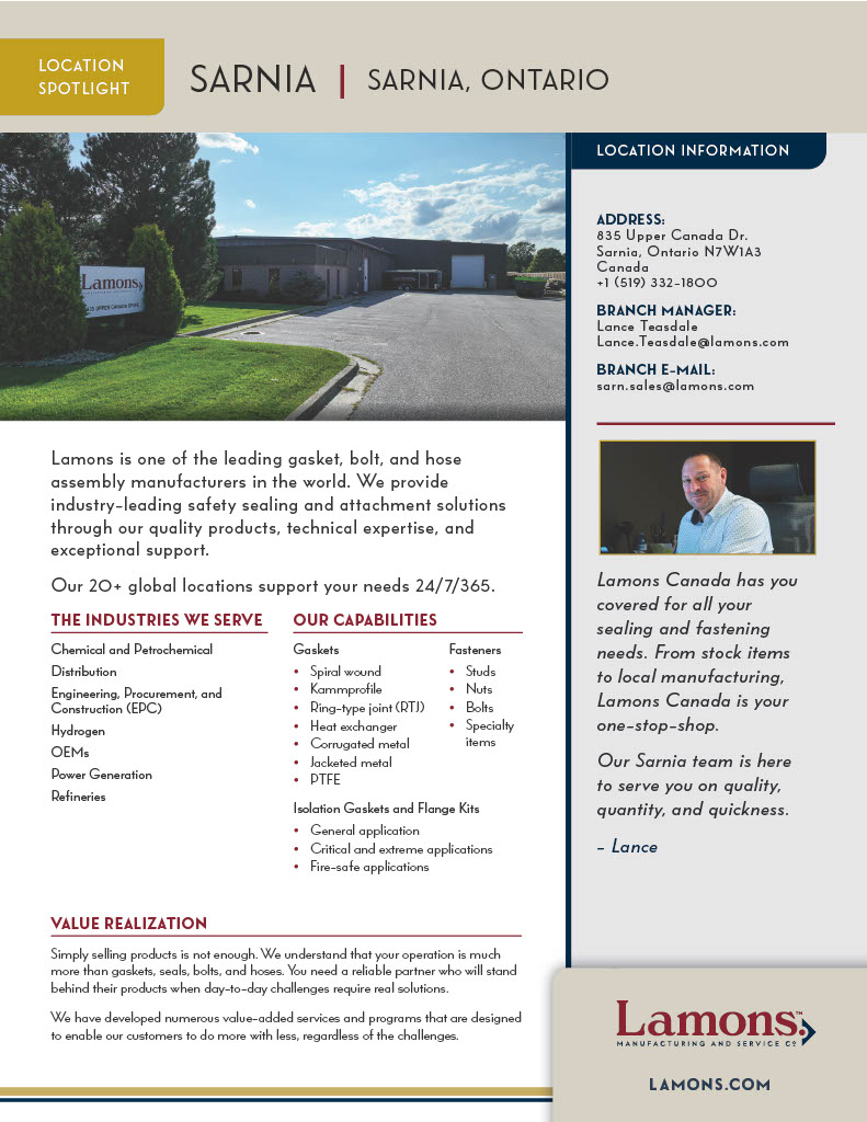 See how Lamons Sarnia supports Canadian industries with local manufacturing, Kammpros, fasteners, shims, and turnaround trailers. Download our one-page flyer for details.